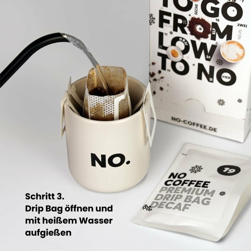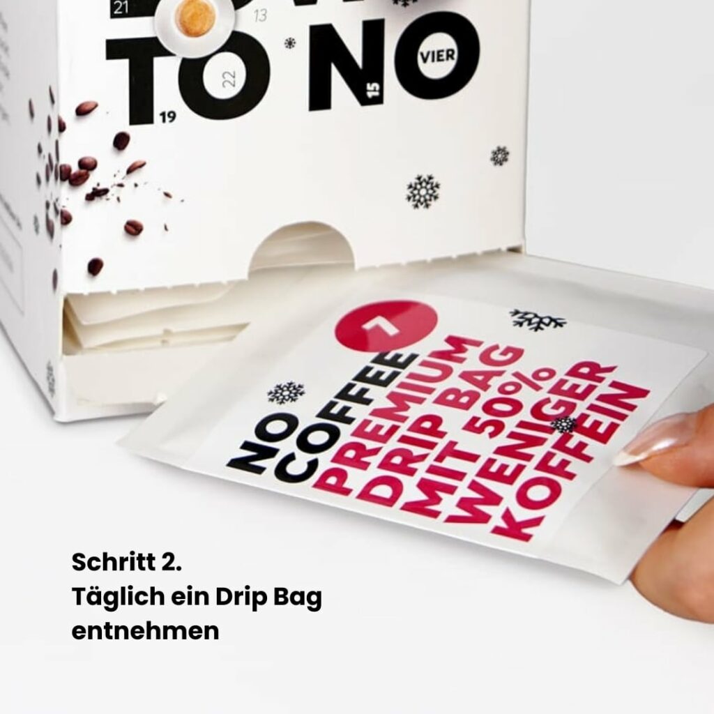 Genieße den Advent ohne Zuckerfallen, Kalorienbomben und schlaflose Nächte. In 24 edlen Drip Bags sinkt alle 6 Tage der Koffeingehalt – bis du entspannt koffeinfrei bist und voller Energie ins neue Jahr startest. Zero Verzicht, maximaler Genuss. So wird 2026 dein Jahr!