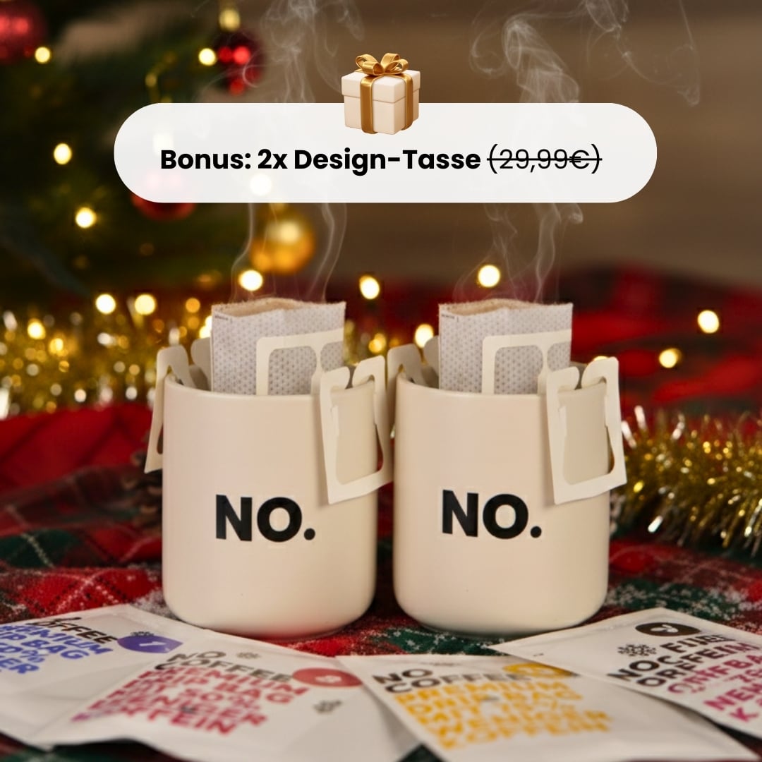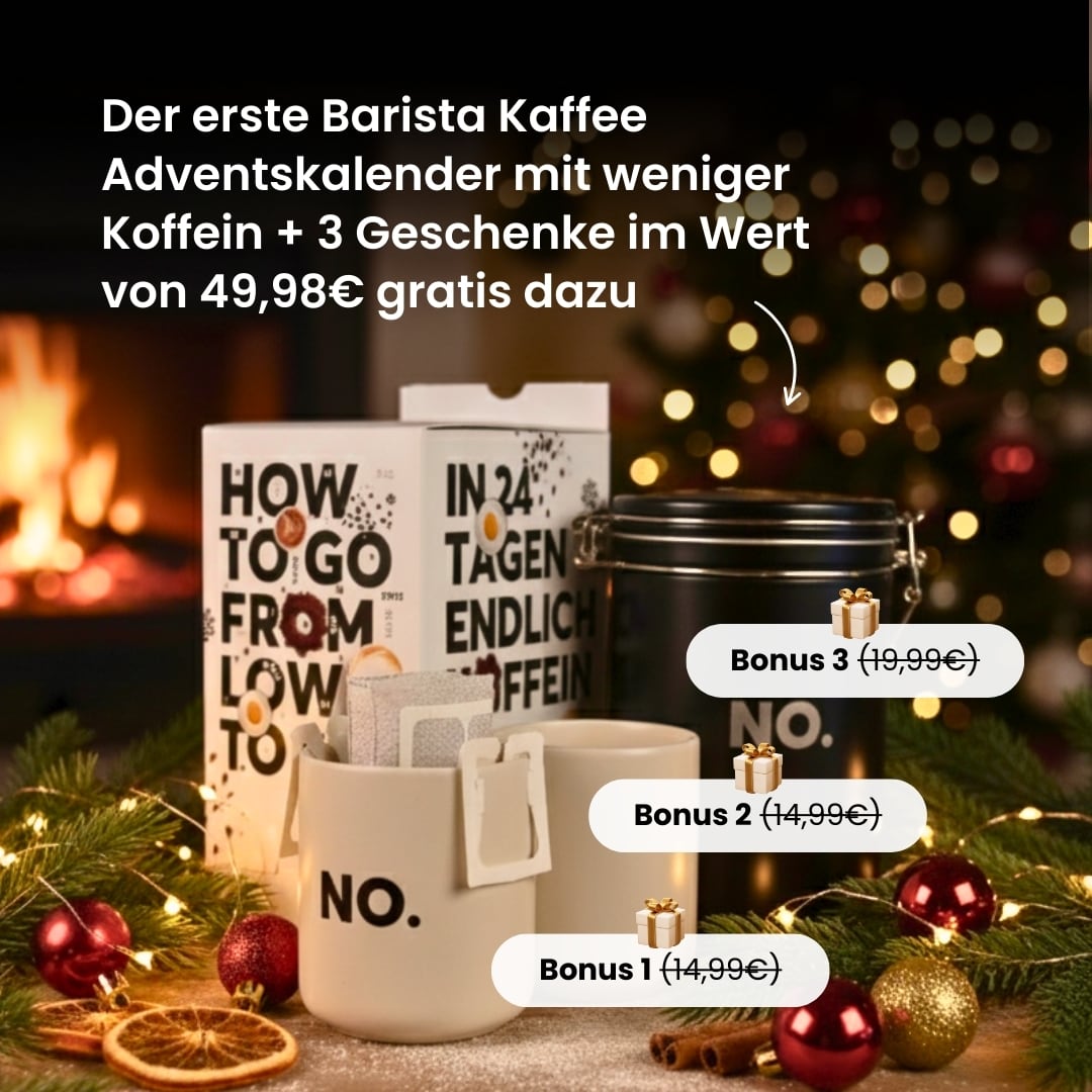 Genieße den Advent ohne Zuckerfallen, Kalorienbomben und schlaflose Nächte. In 24 edlen Drip Bags sinkt alle 6 Tage der Koffeingehalt – bis du entspannt koffeinfrei bist und voller Energie ins neue Jahr startest. Zero Verzicht, maximaler Genuss. So wird 2026 dein Jahr!